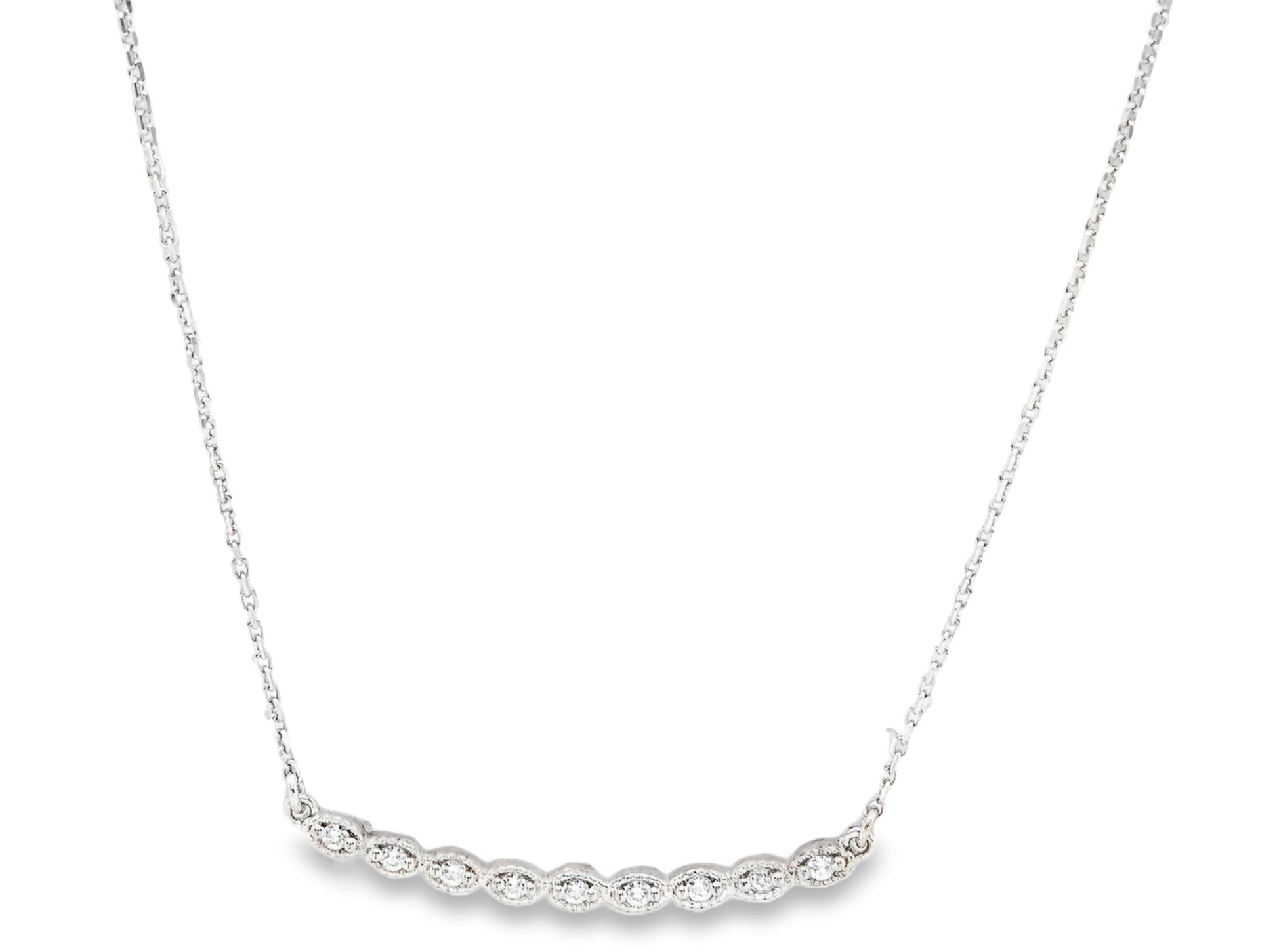Elevate your style with this delicate diamond necklace, crafted in radiant white gold. Featuring a row of meticulously cut round diamonds, this piece showcases exceptional brilliance and fire. The timeless design ensures it will be a cherished addition to any jewelry collection, perfect for adding a touch of sparkle to both casual and formal ensembles.