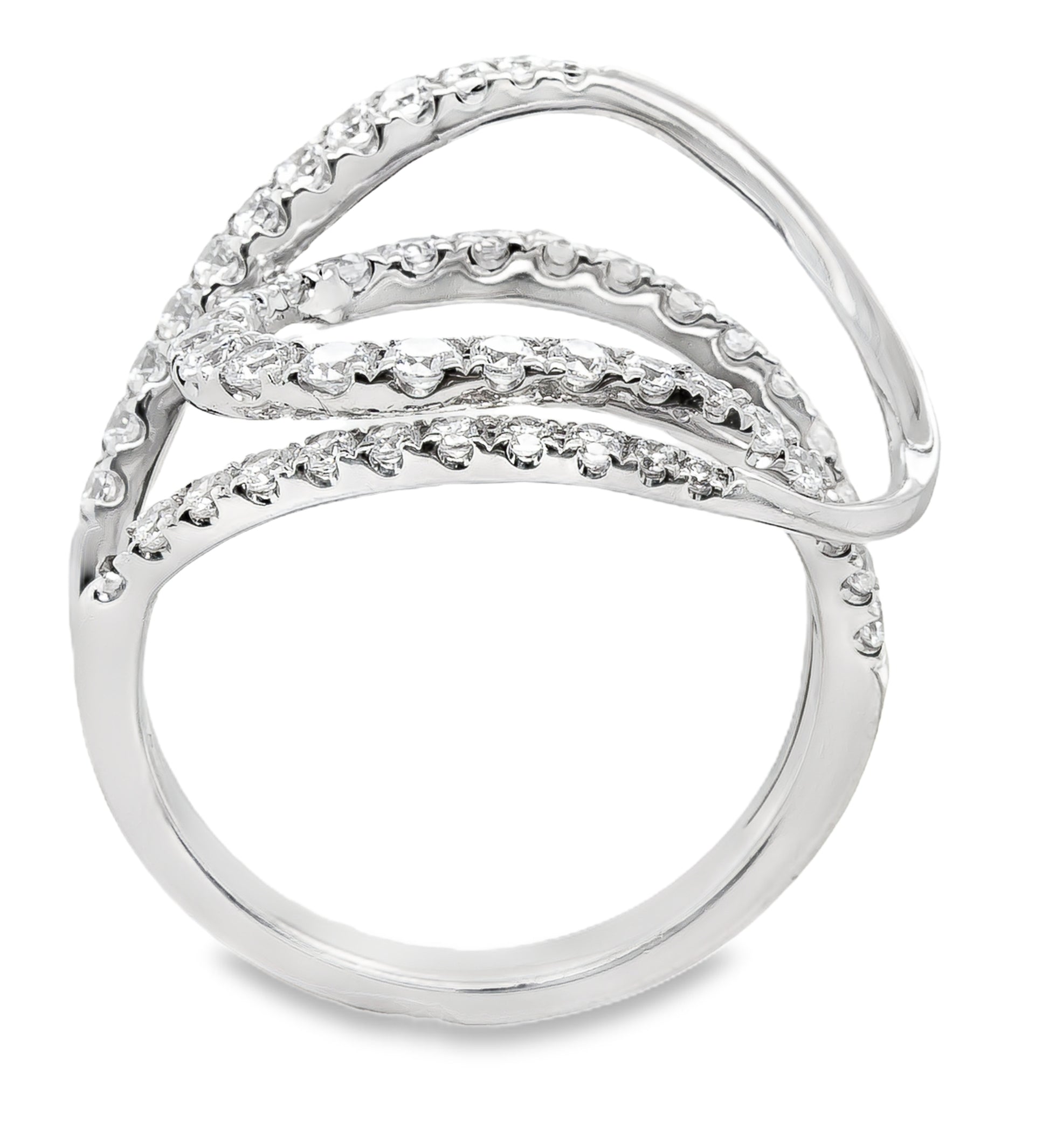 This exquisite, open-gallery ring features a delicate white gold setting that gracefully showcases round brilliant cut diamonds. The transparency and clarity of the diamonds enhance its overall beauty. A timeless piece that will add sophistication to any ensemble.