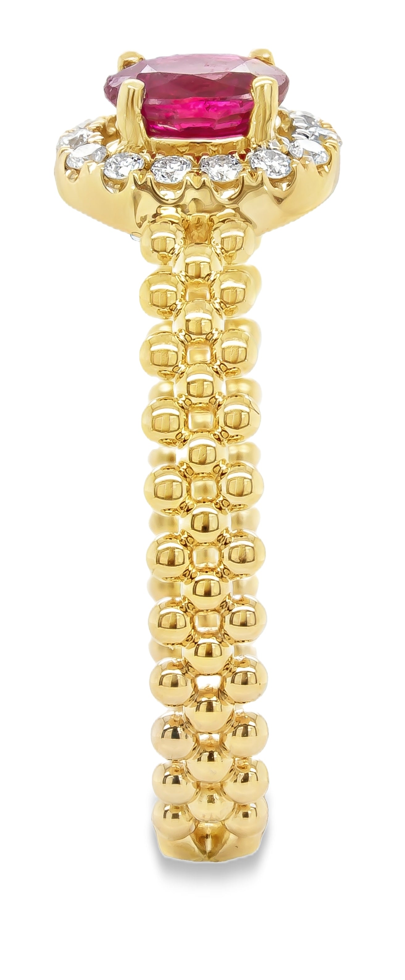 Exquisitely crafted, this luxury fashion ring features a vibrant ruby. The oval cut enhances the gem's smooth surface. Set in lustrous yellow gold, this ring embodies elegance and sophistication, perfect for adding a touch of color to any ensemble. A timeless piece that captures the eye and elevates your style.