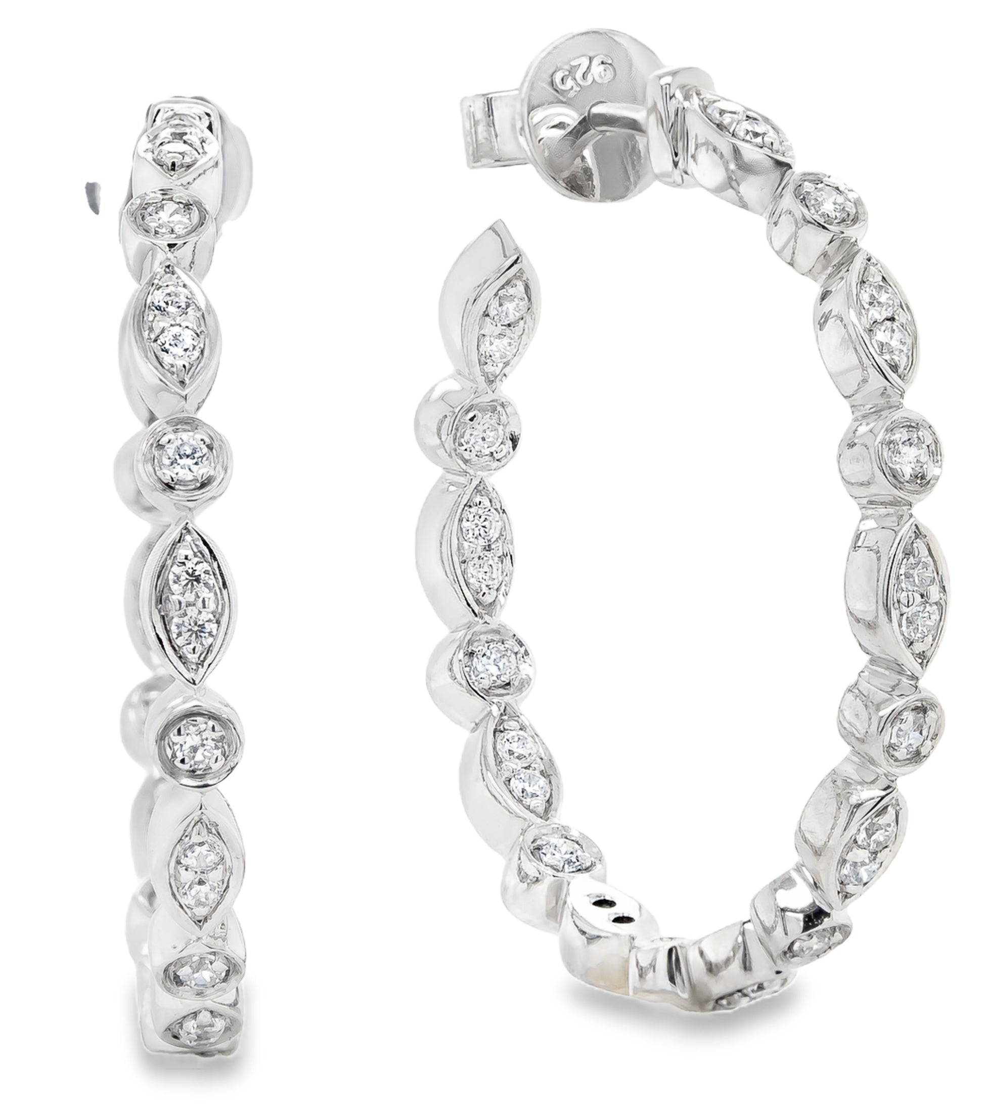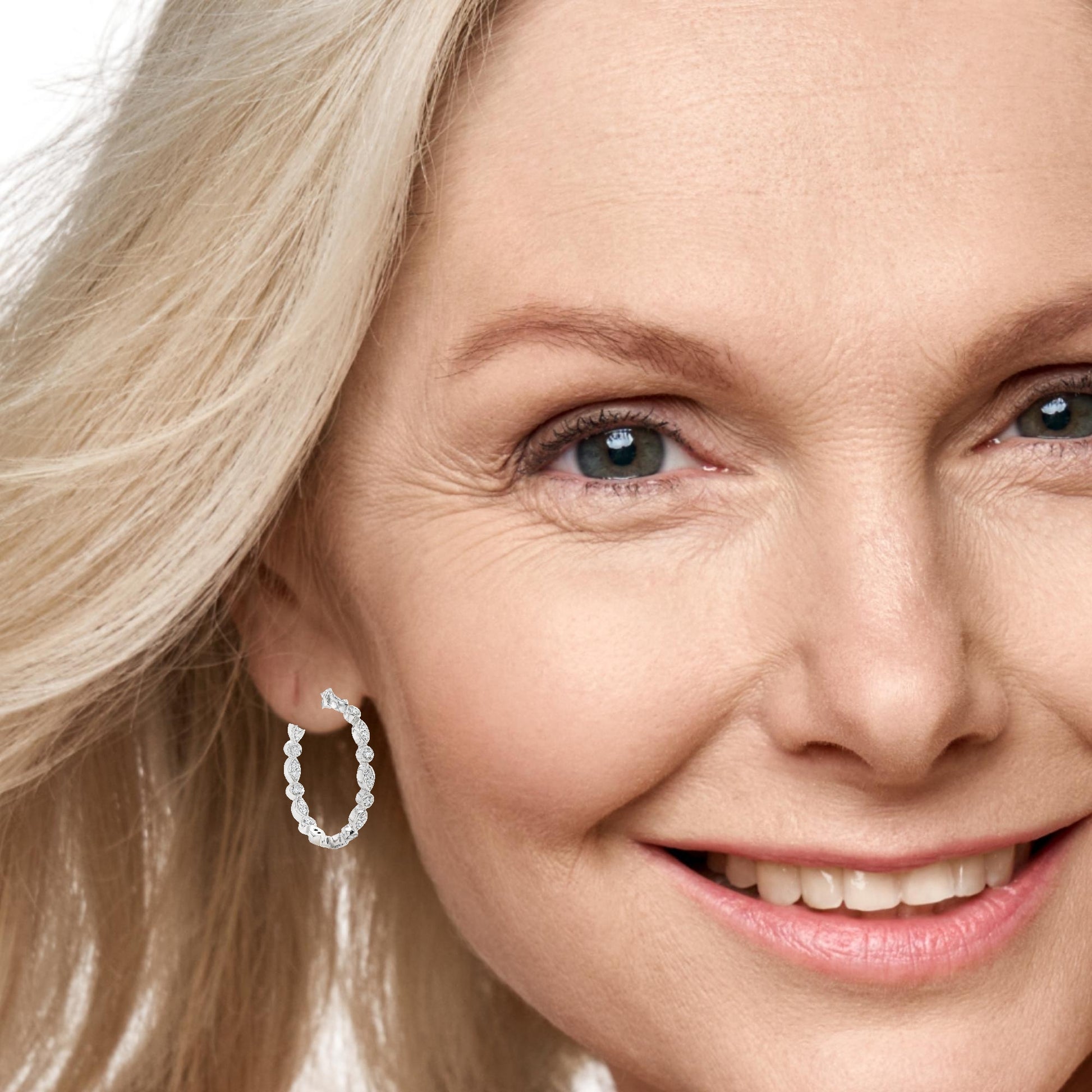 Indulge in the understated elegance of these white gold hoop earrings, each meticulously set with scintillating round cut diamonds. The brilliant cutting style enhances the stones' natural fire, creating a harmonious balance of classic design and refined sparkle, perfect for everyday sophistication or evening allure.