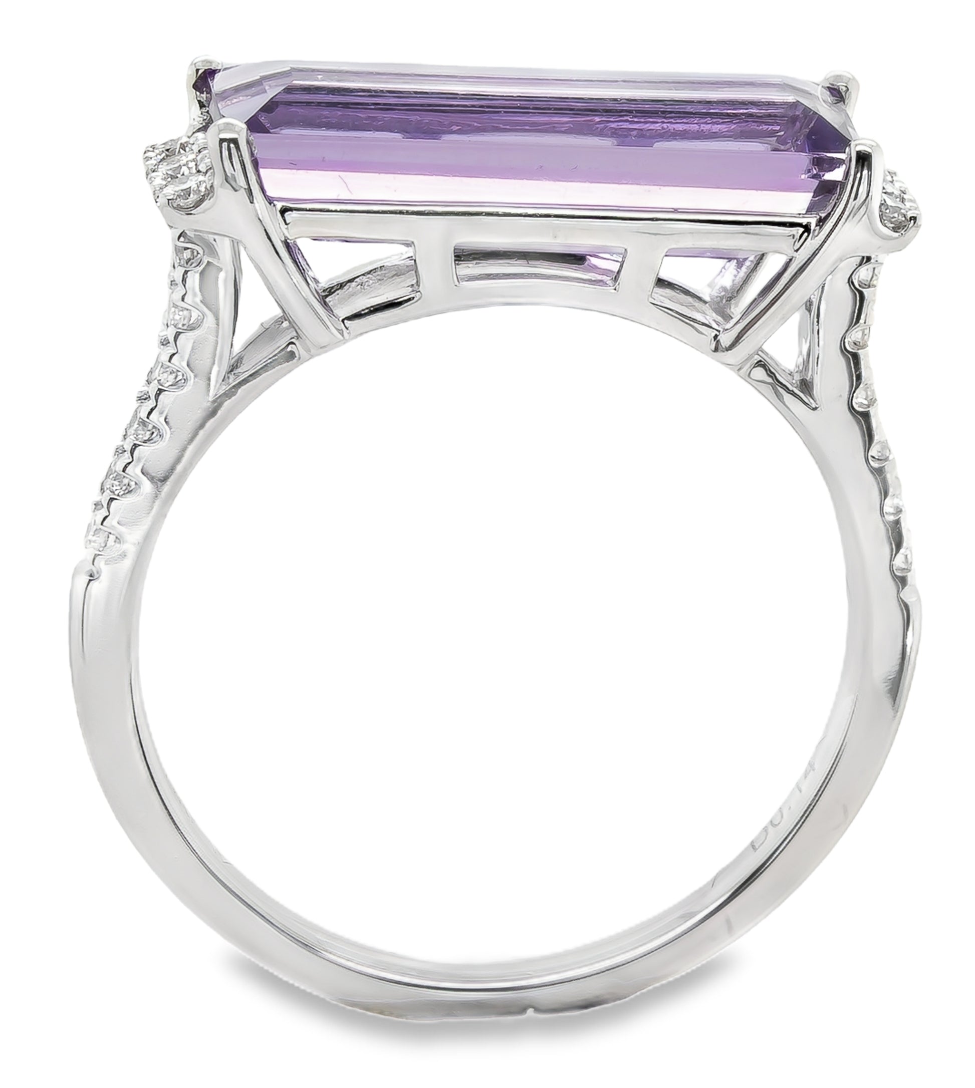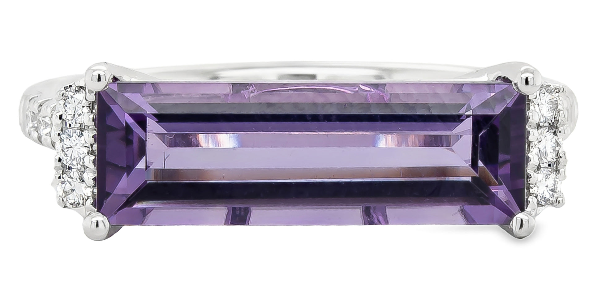 Exquisite white gold cocktail ring featuring an amethyst. This sophisticated ring showcases the rich, purple hue of the amethyst, accentuated by its elegant step-cut facets. Perfect for adding a touch of color and glamour to any ensemble, this ring is a stunning statement piece.